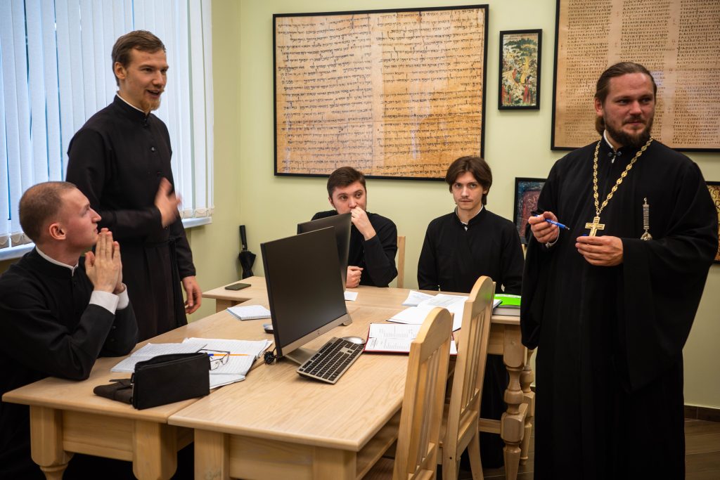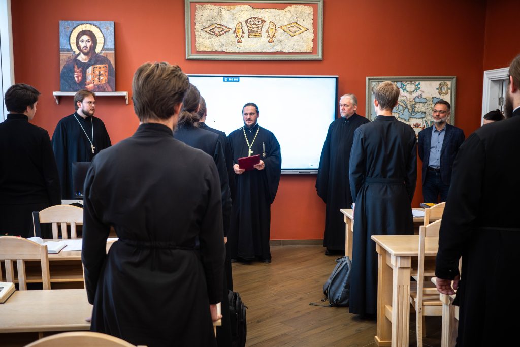 Члены комиссии встретились с ректором Псково-Печерской духовной семинарии и благочинным Псково-Печерского монастыря иеромонахом Прохором (Андрейчуком), первым проректором игуменом Августином (Заярным), проректорами по научной, учебной и воспитательной работе, духовником семинарии, сотрудниками администрации и студентами.