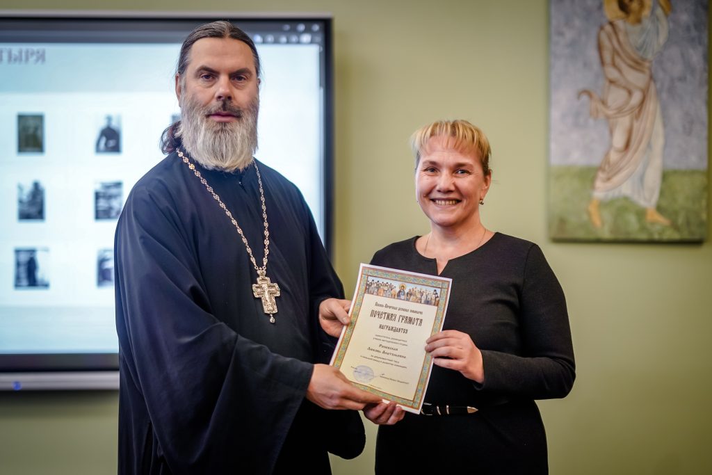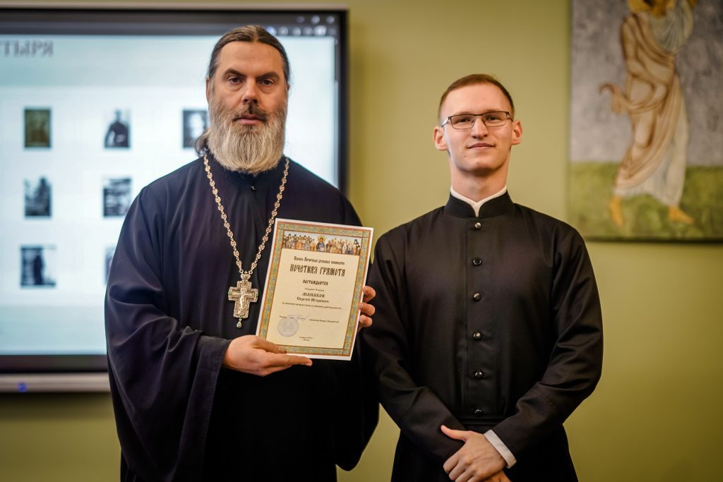 Далее, в стенах Псково-Печерской духовной школы, прошёл актовый день. Ректор семинарии иеромонах Прохор (Андрейчук), поздравил студентов семинарии с днём памяти отца Иоанна и вручил благодарственные письма работникам семинарии и студентам особо проявившим себя в научной и учебной деятельности.